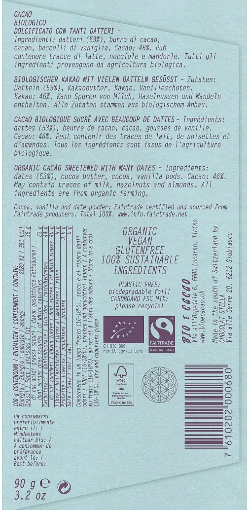 Schweizer Schokolade, nur mit Datteln gesüsst, mit wenigen und natürlichen Zutaten. Angenehm süss, mit einem Geschmack, der an Milchschokolade und Honig erinnert, und einer cremigen Textur. Sie kann auch für Schokoladenrezepte verwendet werden und schmilzt wie ein klassischer Schokoladentafel.