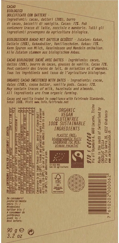 Unsere Schweizer Schokolade ist nur mit Datteln gesüsst und kommt mit wenigen, hochwertigen Zutaten aus. Bitter, aromatisch und wunderbar cremig – perfekt zum Naschen, aber auch zum Schmelzen in deinen Lieblingsrezepten. Biologisch, Fairtrade, vegan, glutenfrei und plastikfrei: Die Verpackung ist vollständig kompostierbar oder recycelbar.