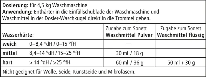 Auch beim Enthärter beschränkt sich Sonett, wie beim Waschmittel, nur auf notwendige und vertretbare Inhaltsstoffe und verzichten auf Füllmittel, auf Phosphate und andere enthärtende Stoffe aus Erdölprodukten wie Phosphonate, NTA (Nitrilotriacetat) und EDTA (Ethylendiamintetraessigsäure).
