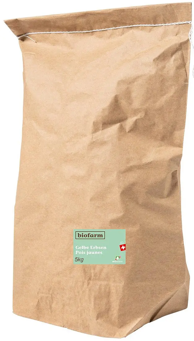 Gelbe Bio Erbsen von Biofarm aus Schweizer Herkunft - Ideal für Eintöpfe, als Salat oder geröstet im Backofen mit Gewürzen und Olivenöl.
