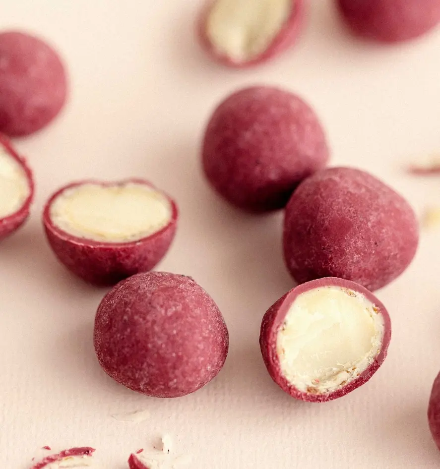 - Knackige Macadamia umhüllt von Himbeerschokolade, Hibiskusblüten- und Umami-Aroma