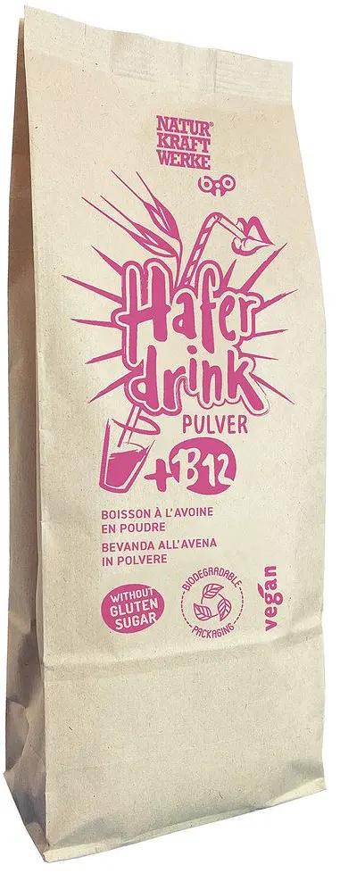 Das NaturKraftWerke Haferdrinkpulver besteht aus biologischem Vollkornhafer und enthält das weltweit einzige für Bio-Lebensmittel zugelassene biovegane Vitamin B12. Einfach mit Wasser anrühren oder shaken – für frischen, cremigen Haferdrink ohne Verpackungsmüll. Ideal für Müesli, Kaffee, Tee oder unterwegs.