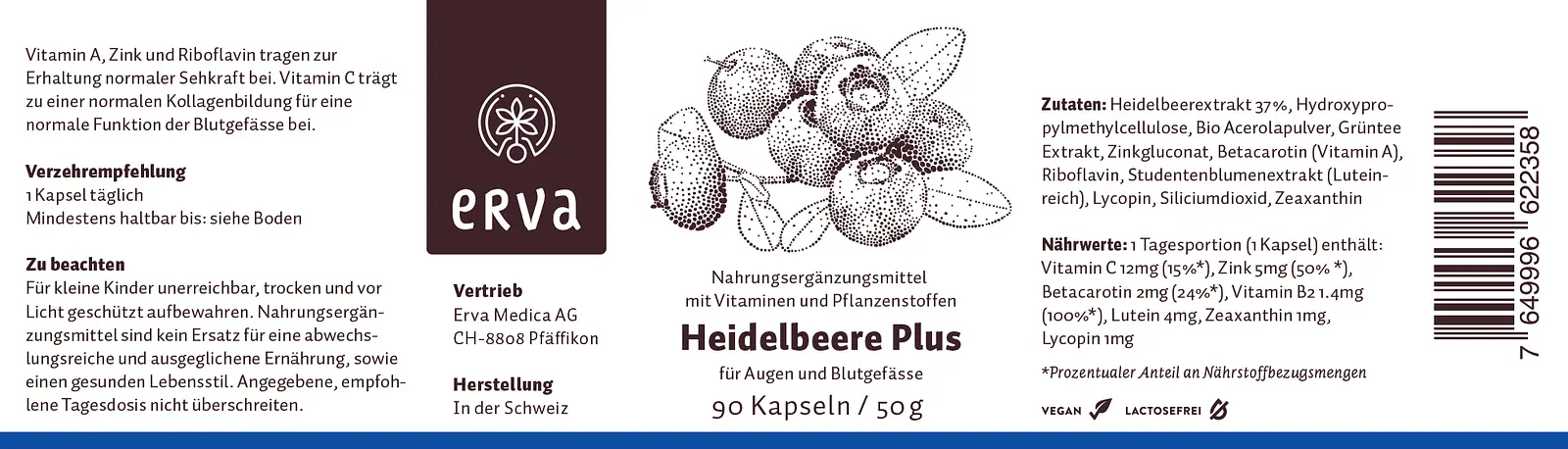Ein Nahrungsergänzungsmittel zum Schutz der Augen und Gefässe mit Heidelbeerextrakt, Vitamin C, Betacarotin, Zink, Riboflavin, Grünteeextrakt, Studentenblumenextrakt, Lutein, Zeaxanthin, Lycopin und Rosenquarz.
