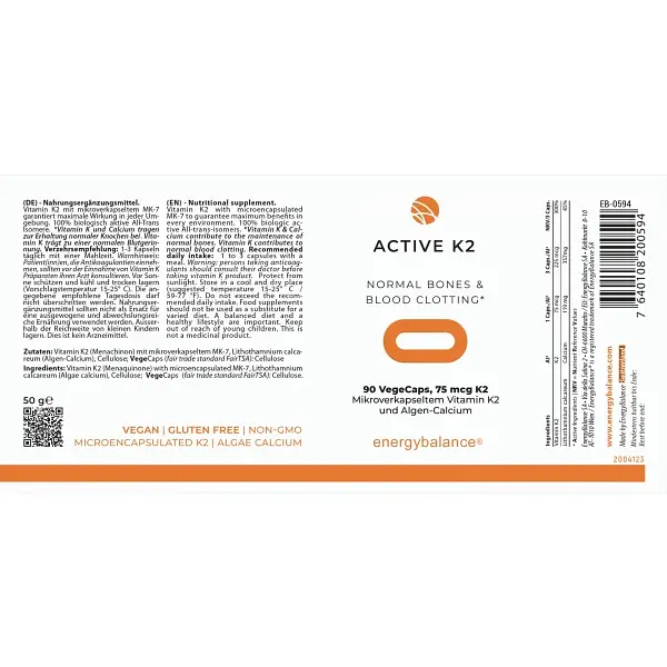 EnergyBalance™ Advanced Vitamin K2 (nennt man auch Menachinon) als mikroverkapseltes MK-7 mit 100 Prozent biologisch aktiven All-Trans-Isomeren. Jede Kapsel enthält 75µg Vitamin K2 (=100% der empfohlenen Tagesdosis ETD).