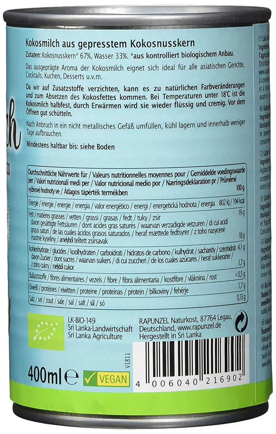Rapunzel Kokosmilch von Biobauern aus Sri Lanka, hergestellt aus gepresstem Kokosnusskern - ideal in kalten und warmen Speisen sowie in Getränken, Cocktails, Eis, Desserts und klassisch für die asiatische Küche.