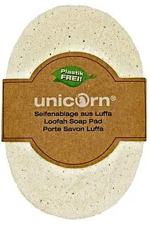 Die unicorn Seifenablage aus Luffa hält jede Seife trocken und das Waschbecken sauber.