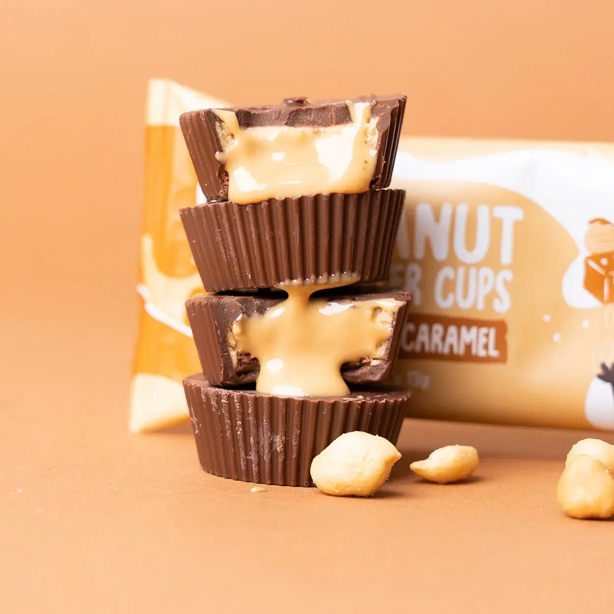 Diese unwiderstehlichen Cups begeistern mit ihrer zartschmelzenden Schokohülle und der soften Füllung aus gesalzenem Karamell und cremigem Erdnussmus.