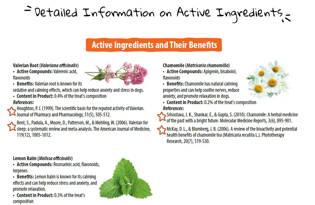 Hokkaido-Kürbis 20 %, Kichererbsen, getrocknete Kartoffelfasern, Leinsamen, Kürbismehl, Johannisbrotmehl 5,5 %, Süßkartoffel, Leinsamenmehl, Sesamsamen, kaltgepresstes Kokosöl, Chicoréewurzel, Inulin 0,5 %, Baldrian 0,4 %, Natriumhydrogencarbonat, Zitronenmelisse 0,3 %, Bierhefe 0,2 %, Kamille 0,2 %;