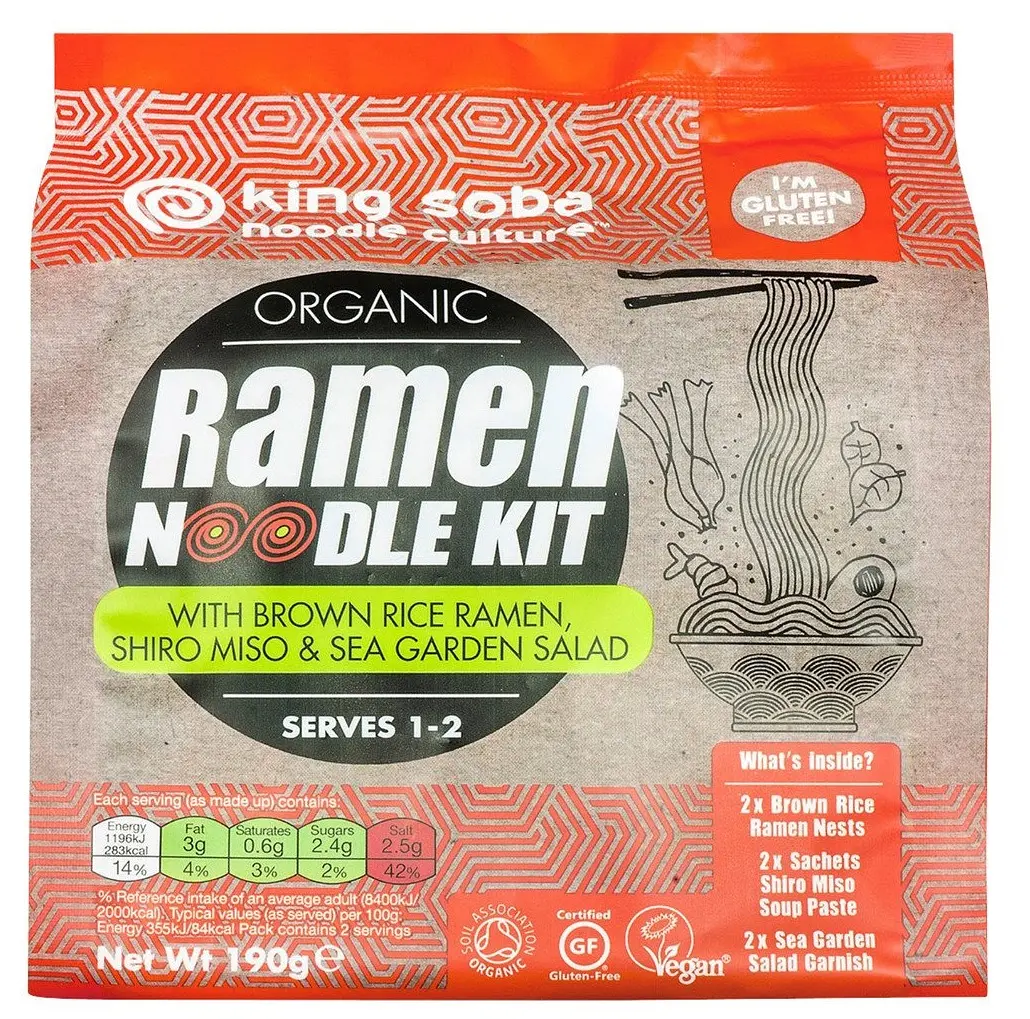 Zubereitung King Soba Ramen Nudeln Die Nudeln und den Inhalt des Portionsbeutels Misobrühe in eine Pfanne geben und mit ca. 500 ml Wasser bis zur gewünschten Bissfestigkeit aufkochen. Nudeln in eine Schüssel geben und mit der Suppe bedecken, mit dem Algensalat und gewünschtem Gemüse garnieren und geniessen.