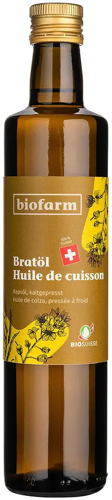 Das kaltgepresste Raps-Bratöl von Biofarm wird aus einheimischen HOLL-Rapssamen gewonnen und ist naturbelassen sowie nicht raffiniert. Dank seines hohen Ölsäuregehalts und des geringen Anteils an Linolensäure ist es besonders hitzestabil – ideal zum Braten und Anbraten. Mild im Geschmack und vielseitig in der Küche einsetzbar.