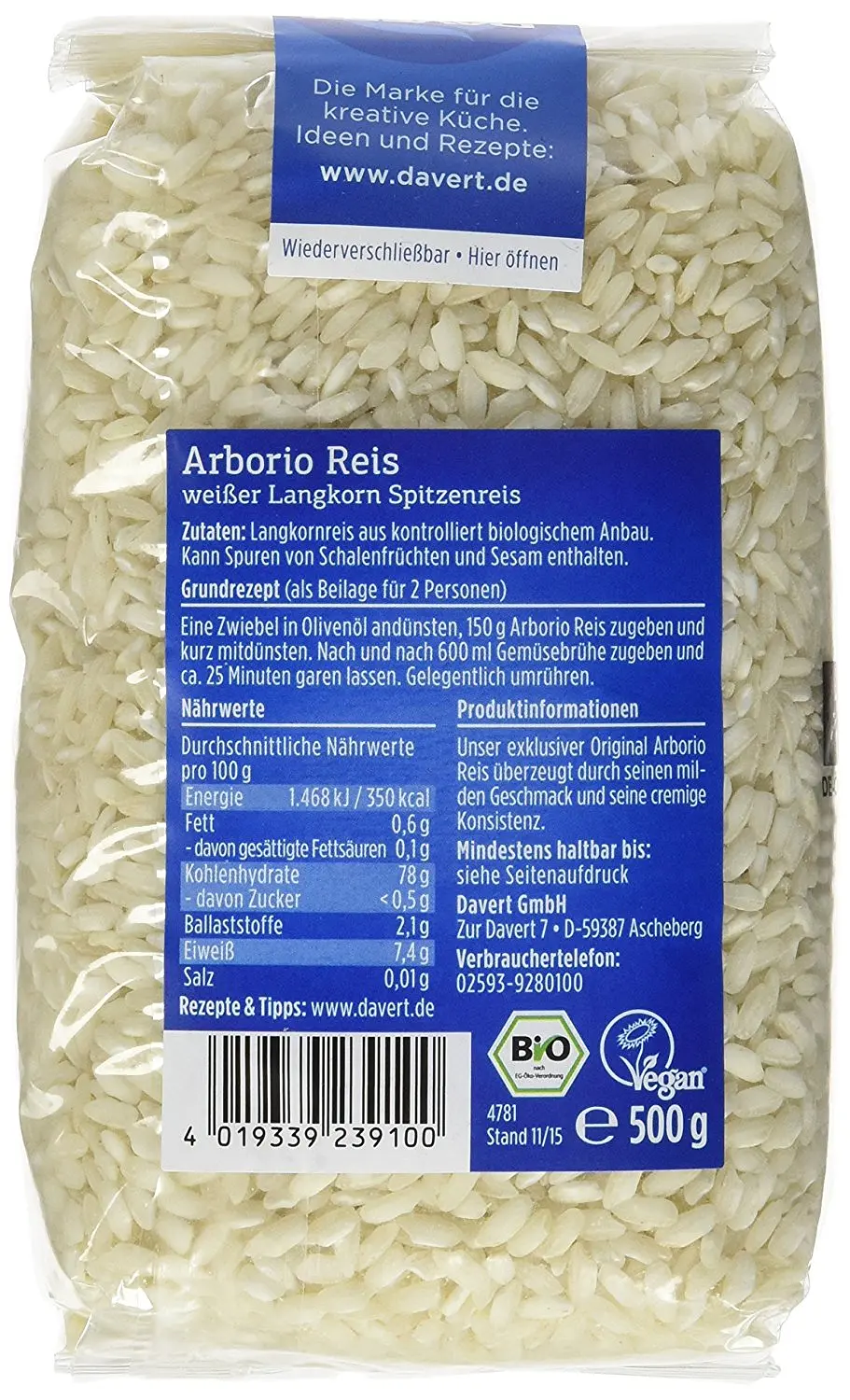 Echter Arborio Reis von Davert eignet sich hervorragend für die Zubereitung von typischen Risotto-Gerichten.