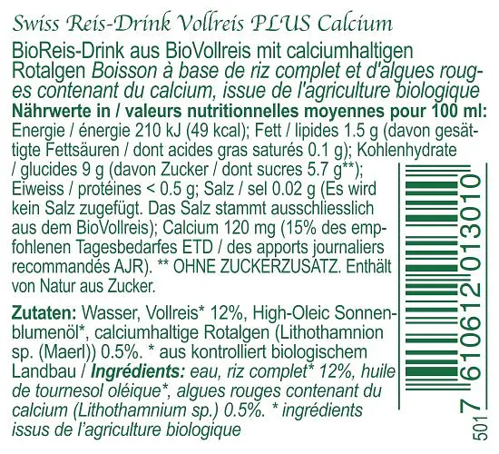 Die feine & leichte pflanzliche Alternative Swiss Rice-Drink Vollreis Calcium aus kontrolliert biologischem Reis ist ohne zugesetzten Zucker natürlich süss, bekömmlich und leicht verdaulich.