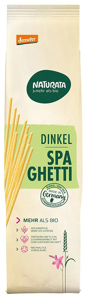 Dinkel Spaghetti mit fein nussigem Geschmack. Der Dinkel in Bio-Qualität wird in der Schwäbischen Alb in Deutschland angebaut und punktet so auch mit kurzen Transportwegen.