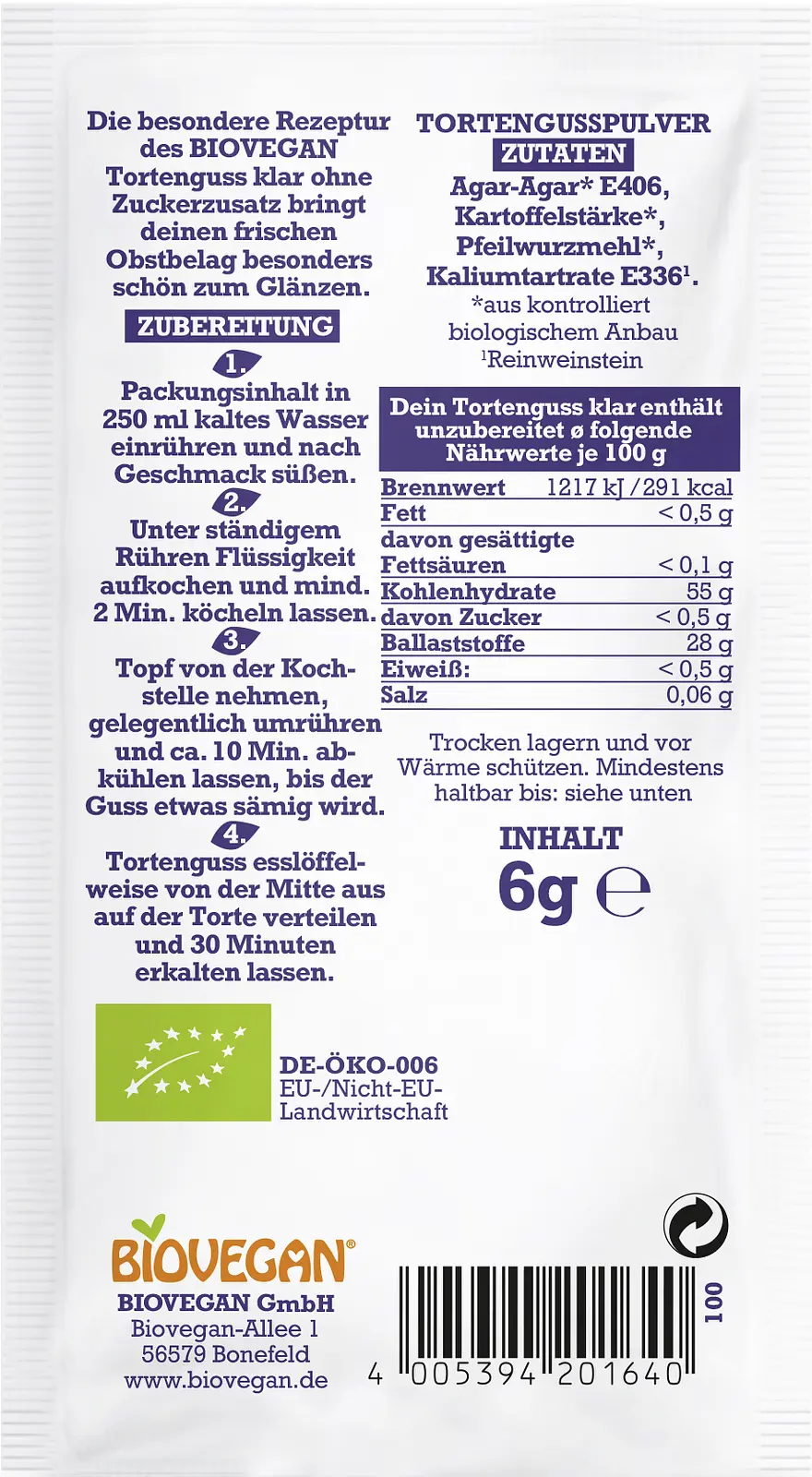 Tortenguss Klar von Biovegan ist optimal für die schnelle und gesunde Zubereitung von leckeren Obstkuchen und sollte daher in keinem Haushalt fehlen. Der erste Tortenguss auf pflanzlicher Basis in BIO-Qualität.
