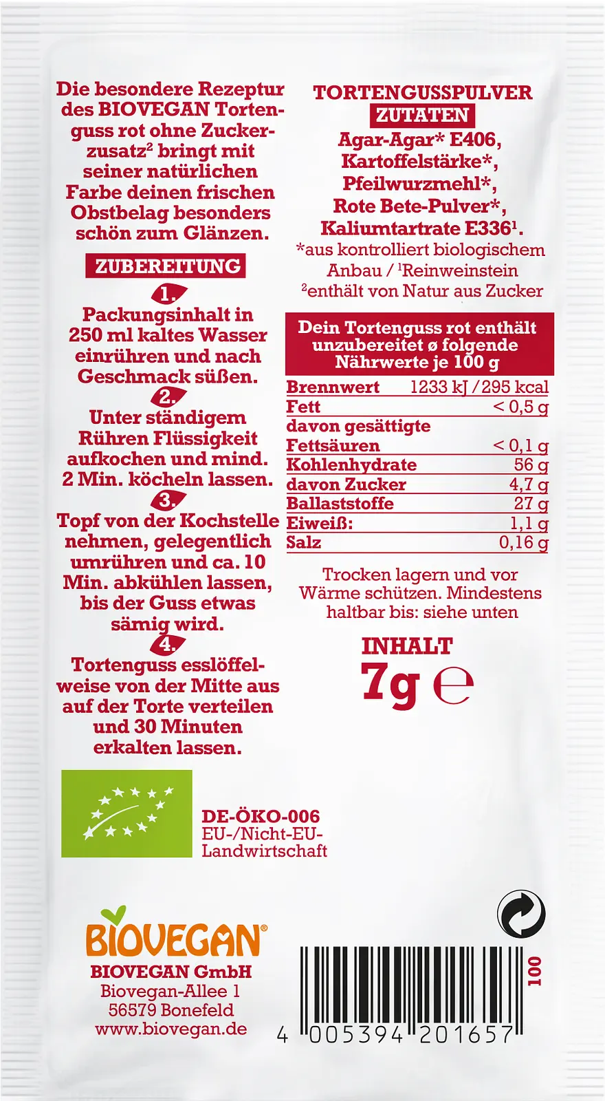 Roter Tortenguss von Biovegan ist der erste rote Tortenguss auf pflanzlicher Basis in BIO-Qualität! Die feine Konsistenz und natürlich rote Farbe des Tortengusses bringen die Fruchtigkeit des Belages optimal zur Geltung.