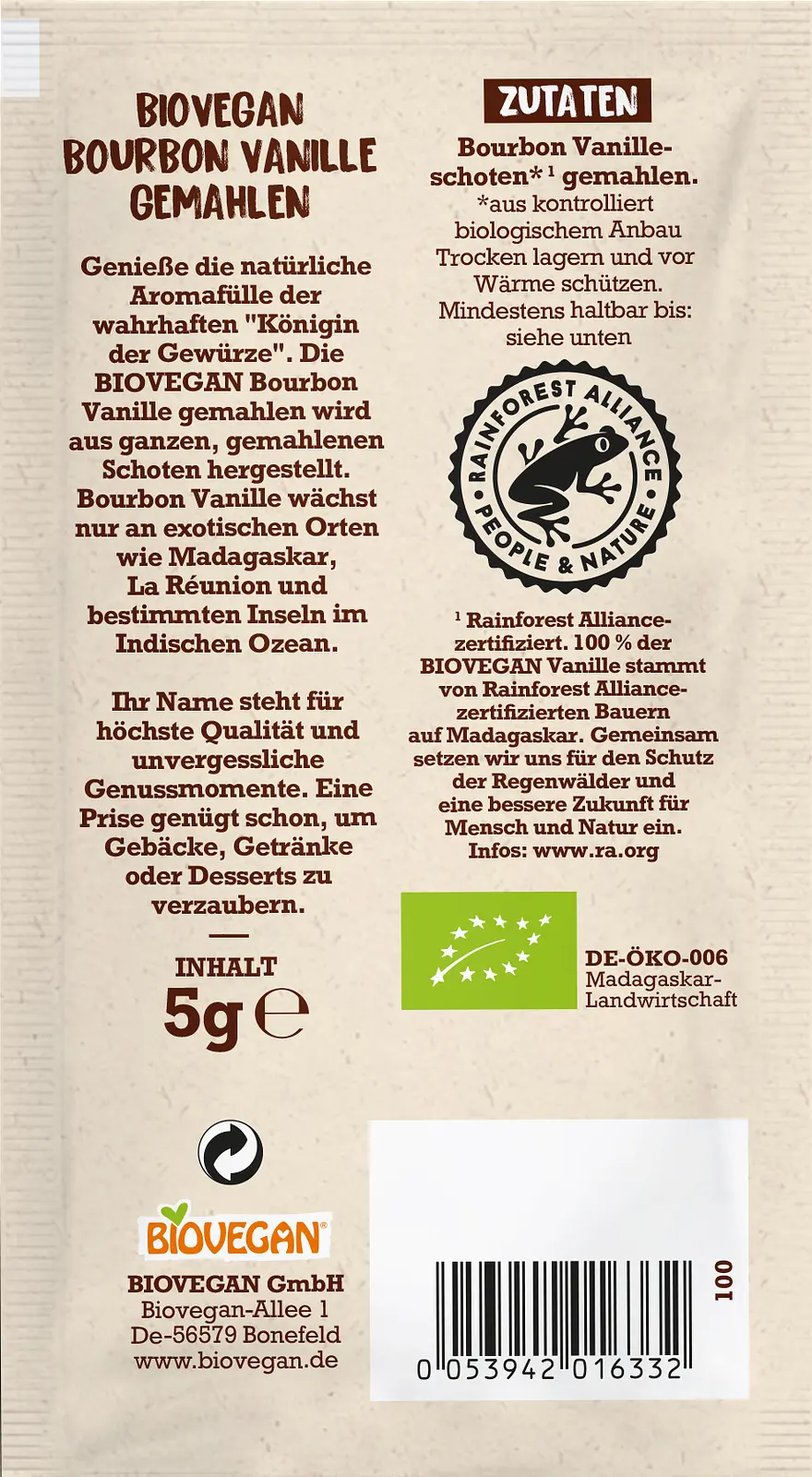 Biovegan Bourbon Vanille wird nur aus den ganzen, gemahlenen Schoten hergestellt. Im Gegensatz zum künstlich hergestellten ,Vanillin´ enthält die BIO Bourbon Vanille von Biovegan die natürliche Aromafülle der wahrhaften ,Königin der Gewürze´.