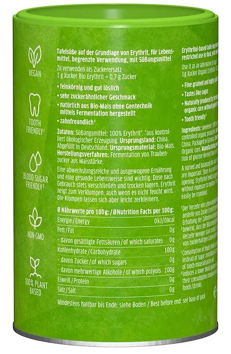 Mit Xucker Bio Erythrit ist der kalorienfreie Zuckerersatz auch in Bio-Qualität erhältlich! Xucker Bio Erythrit ist das ideale Süssungsmittel im Rahmen einer kalorienbewussten Ernährung und besteht wie Xucker Light aus 100% Erythrit. Xucker Bio Erythrit wird aus zertifiziertem Bio-Mais gewonnen. Um die Bio-Qualität von Xucker Bio Erythrit stets in höchsten Standards zu gewährleisten, werden Anbau, Rohstoffe und Produktionsbetriebe regelmäßig strengen Kontrollen durch externe Gutachter unterzogen.