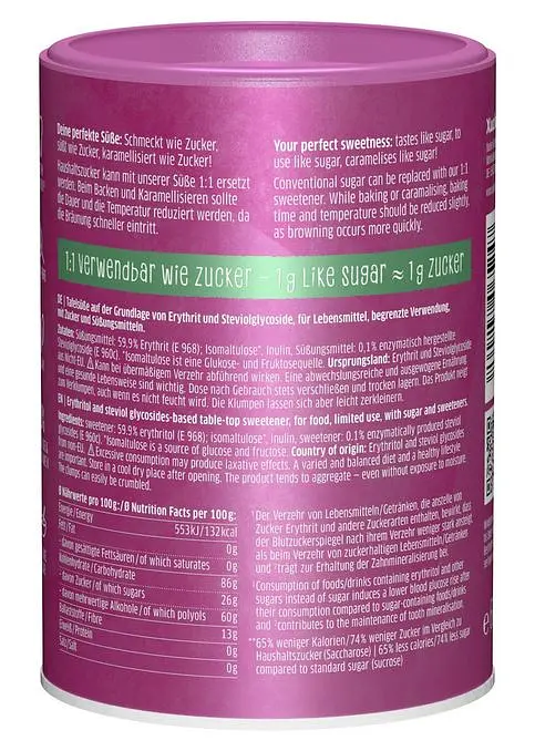 Süßungsmittel: 59,9% Erythrit (E 968); Isomaltulose*, Inulin, Süßungsmittel: 0,1% enzymatisch hergestellte Steviolglycoside (E 960c)