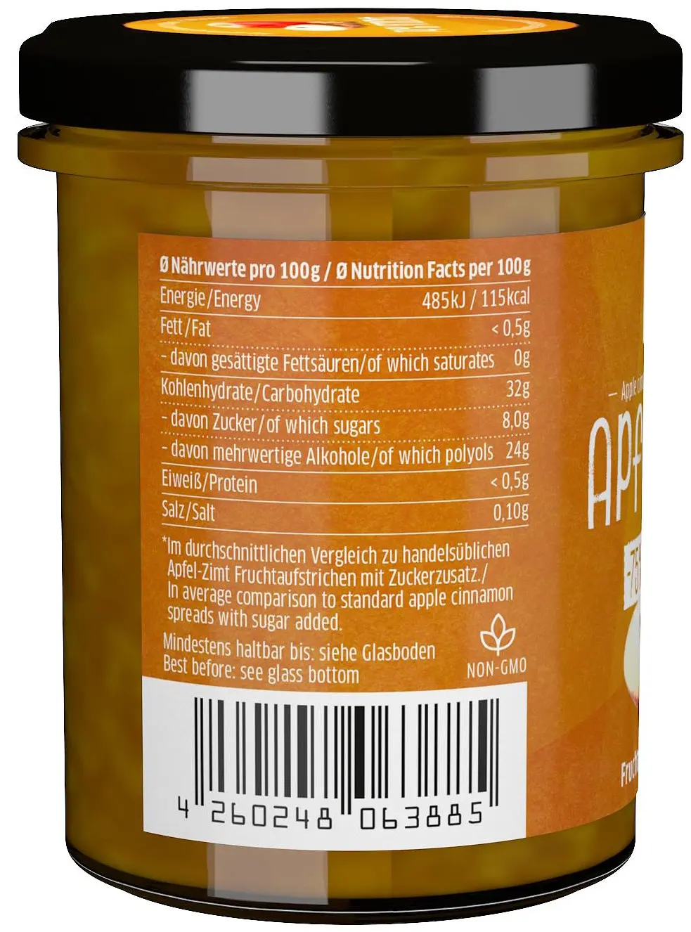 74,5% Äpfel, Süßungsmittel: Xylit; Zimt, Geliermittel: Pektine, Dextrose; Säuerungsmittel: Citronensäure.