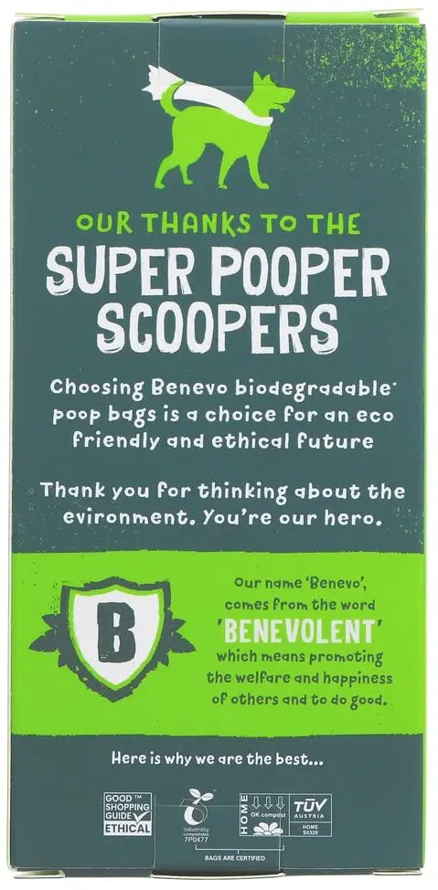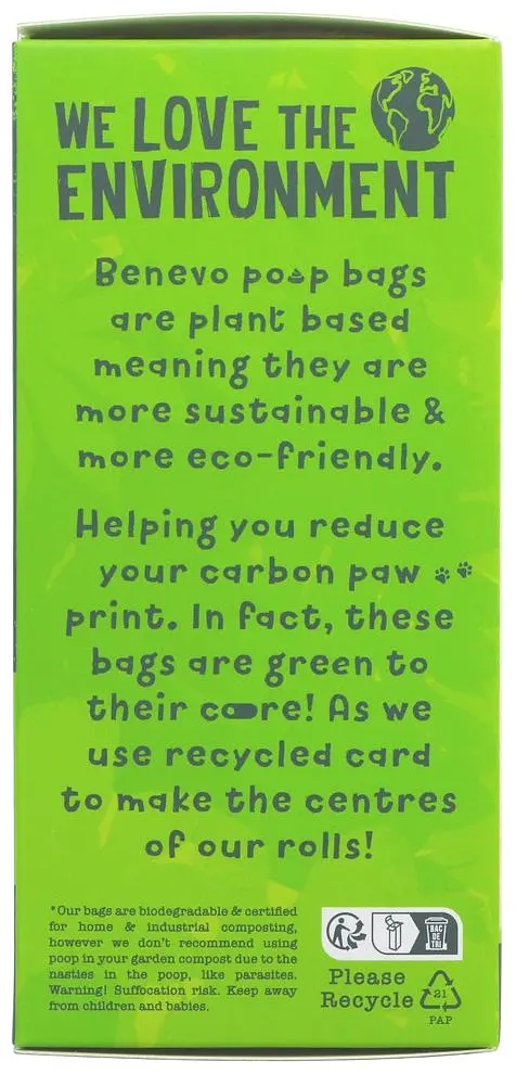 These plant based doggy poop bags are certified biodegradable and compostable. Unlike degradable poop bags which simply degrade and break down into millions of plastic parts in the ground, these bags allow the metabolism of microorganisms to break the material down so it decomposes in the natural environment. Technically all plastic is degradable so it's important to use eco-friendly bags that can biodegrade and be composted. The source material is also important as a lot of degradable and some biodegradable bags are fossil based. Benevo bags use corn starch base, a sustainable and eco-friendly source of material. The 'greener choice' as the packaging says. No chemical scent added. These bags come unscented. The box is made from recycled paper and printed with water-based inks. The roll core is also made from recycled paper.