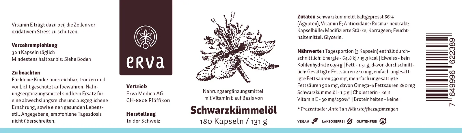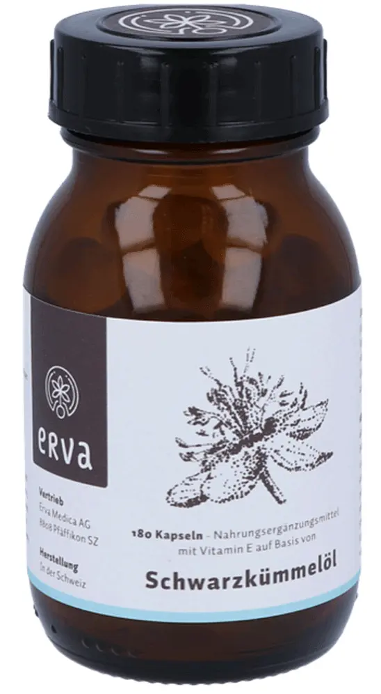 A dietary supplement with black seed oil and vitamin E. Each erva black cumin oil capsule contains 500 mg of pure, gently pressed oil from selected seeds of Egyptian black cumin (Nigella sativa). The effect of regulating our immune system is mainly due to essential oils and omega-6 fatty acids.