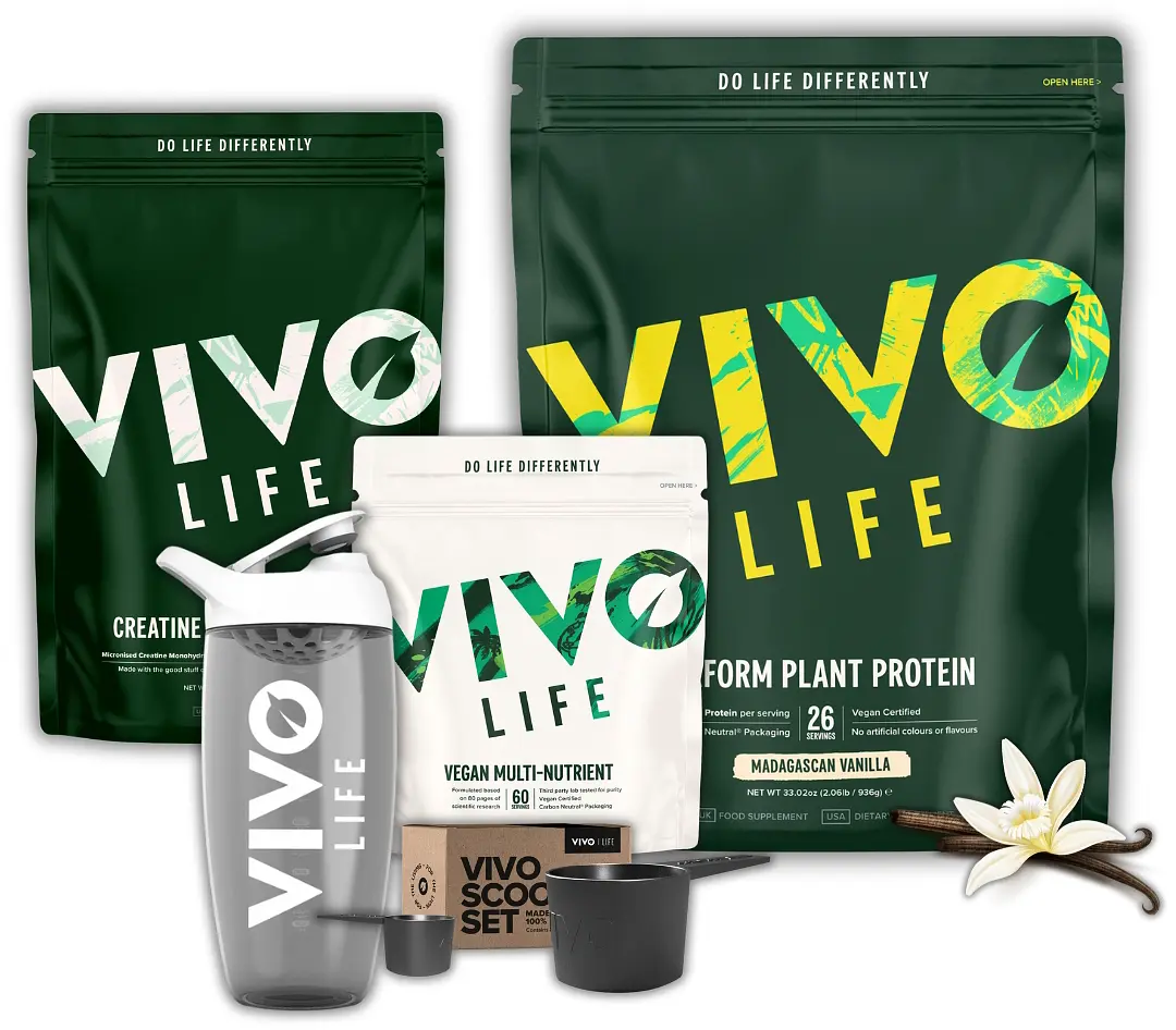 Whether for intense training, fast recovery, or balanced everyday nutrition – this set gives you all the essentials for your plant-based performance. The Power & Recovery Set combines Vivo Life’s popular Perform Protein in creamy-smooth Madagascan Vanilla with premium creatine, vegan multinutrient capsules, a BPA-free shaker, and a handy scoop set for precise servings.