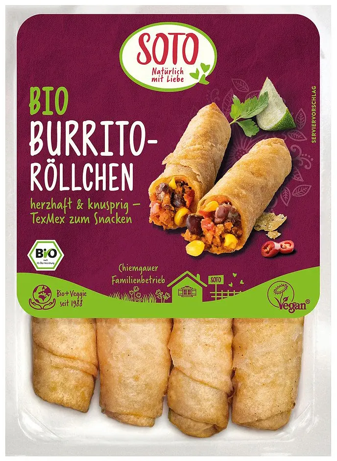 Burrito Rolls TexMex Organic by Soto offer a flavourful mix of Mexican-inspired ingredients wrapped in a crispy wheat pastry. The spicy-savoury filling combines beans, corn, peppers and tofu with a smoky seasoning – perfect for grilling, sharing or quick meals at home.
