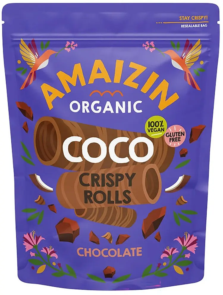 The Coco Crispy Rolls from Amaizin in the chocolate version - a light and crispy sweet snack.
