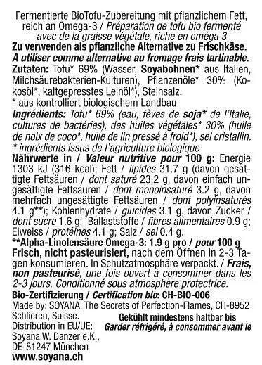 Soyananda is a great vegan alternative to classical cream cheeses, it's mild, easy digestible and contains many high-quality fats like raw flaxseed and coconut oils. The organic fine herbs and garlic accomplish the great taste.