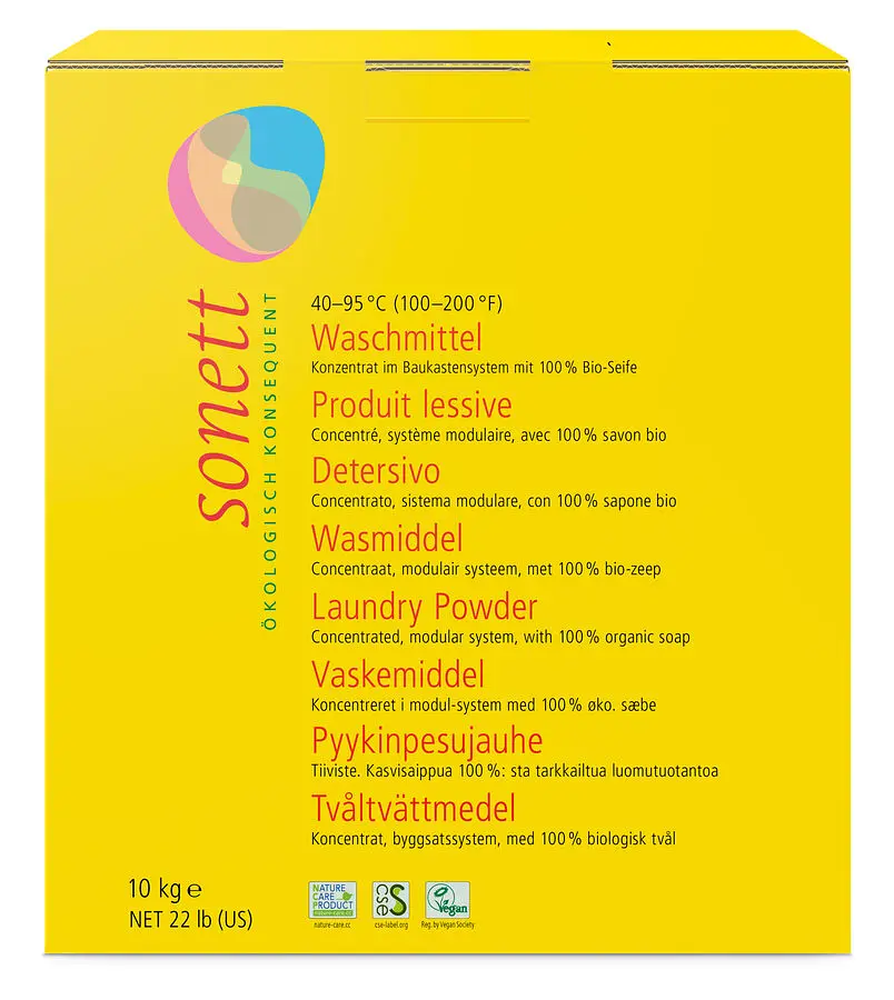 The Sonett detergent contains soap as its main active ingredient, which is made from various vegetable oils - palm oil, rapeseed oil and coconut oil - by boiling with lye. The oils are 100% organically grown. As a washing-active substance, soap uniquely combines all the dirt-wetting, dirt-dissolving and dirt-carrying properties necessary for the washing process.