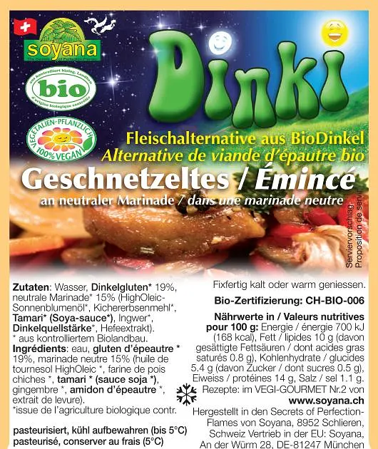 Soyana Dinki Spelt Strips is a vegan meat alternative made from spelled with neutral marinade. It has a delicate consistency, is ready to use and very digestible.