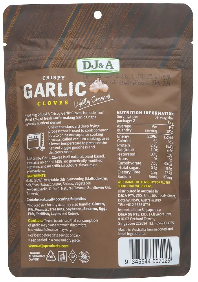 DJ&A Garlic Cloves is a ready-to-eat snack and is also completely natural, vegan and a good source of fibre. The garlic is GMO-free, contains no MSG and has no artificial colours, flavour enhancers or preservatives.