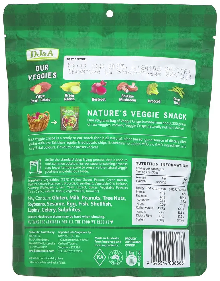 DJ&A vegetable crisps are a ready-to-eat snack and are also completely natural, vegan and a good source of fibre. The vegetable crisps are GMO-free, contain no MSG and are completely free from artificial colours, flavour enhancers or preservatives.