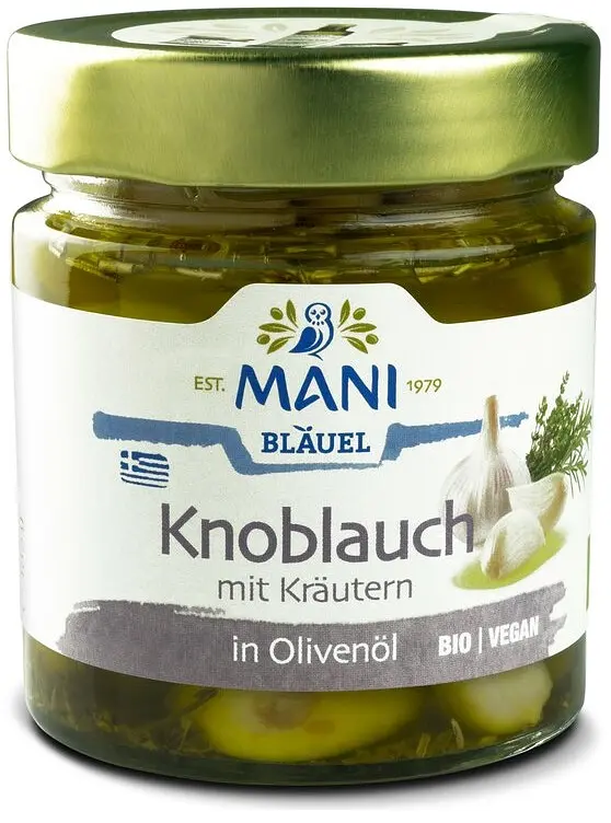 The organic garlic is carefully harvested in Greece and preserved in finest organic extra virgin olive oil. Flavored with rosemary, oregano, and thyme, it provides a mild and aromatic taste. Perfect for enhancing sauces, soups, salads, or baked potatoes – also delicious spread on freshly toasted bread.