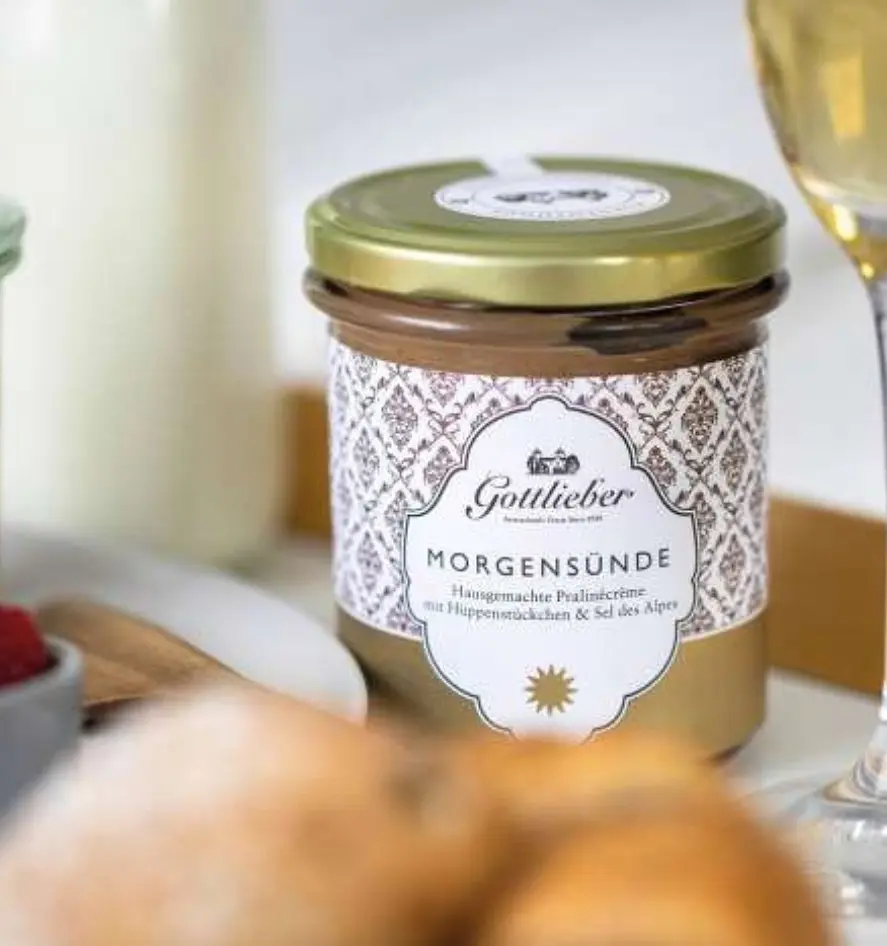 When the homemade praline cream meets Hüppen pieces and Swiss Sel des Alpes, the result is an irresistibly delicious spread called “Morgensünde” (morning sin). The popular Gottlieber Hüppen filling praline forms the basis of the creamy “Premium” spread. It is enriched by hand with crunchy Hüppen pieces and a hint of Swiss Sel des Alpes.