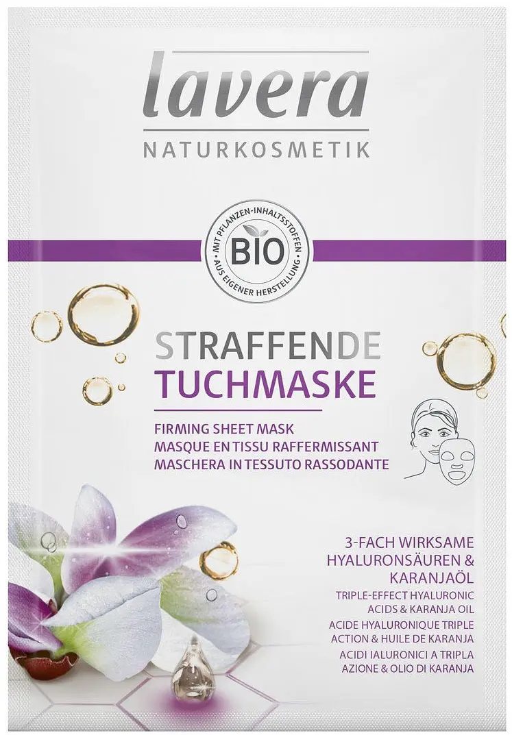 Firming hyaluronic sheet mask by Lavera with triple effective hyaluronic acid and karanja oil
