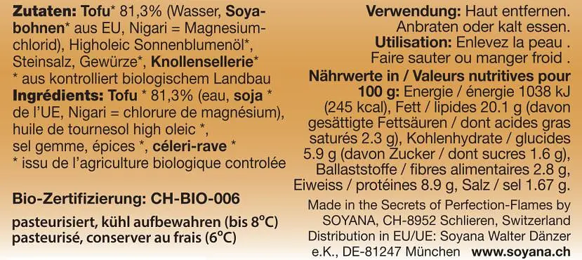 Tofu* 81.3% (water, SOYA beans* from EU, nigari = magnesium chloride), higholeic sunflower oil*, rock salt, spices*, CELERY*.