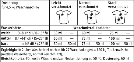 Application: Fill Softener into the detergent compartment of the washing machine and Laundry Liquid into a measuring ball and put it straight into the drum.
