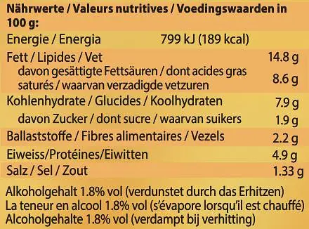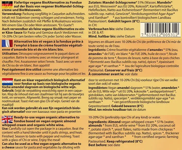 ALMOND whipped cream* 51% (water, ALMONDS* from EU), vegan white wine* (SULFITE) from EU 20%, coconut oil*, potato starch*, nutritional yeast, chickpea natto* (fermented with Bacillus Subtilis ssp. natto) spices*, Thickener Agar-Agar* and Xanthan Gum*