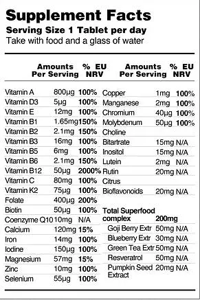 Calcium Carbonate, Magnesium Citrate, Microcrystalline Cellulose, Ascorbic Acid, Super Food Blend (Goji Berry Extract, Blueberry Extract, Green Tea Extract, Pumpkin Seed Extract, Resveratrol (Grape Extract)), Citrus Bioflavonoids Complex, Choline Bitartrate, Iron Amino Acid Chelate, D-Alpha Tocopherol, Nicotinamide, Anticaking agents (Magnesium stearate, Silicon Dioxide), Rutin, Inositol, Calcium Pantothenate, Pyridoxine Hydrochloride, Thiamine Hydrochloride, Bladderwrack Extract, Riboflavin, Zinc Citrate, Selenium Methionine, Mixed Carotenoid Complex, Vitamin A (Maltodextrin, Corn Starch, Vitamin A), Manganese Sulphate, Co-enzyme Q10, Lutein Powder, Copper Sulphate, Vitamin D (Medium Chain Triglyceride, Arabic Gum, Sodium Ascorbate, Cholecalciferol), Beta Carotene, Vitamin K2, Folate, Chromium Picolinate, Sodium Molybdate, Biotin, Vitamin B12, Tablet coating (Hydroxypropylmethyl Cellulose, Glycerol).
