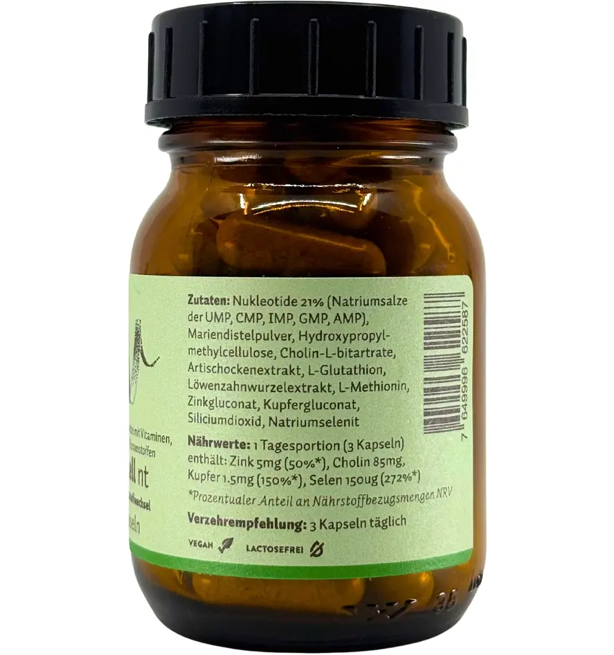 Food supplement with nucleotides, minerals and plant substances for the liver and fat metabolism.