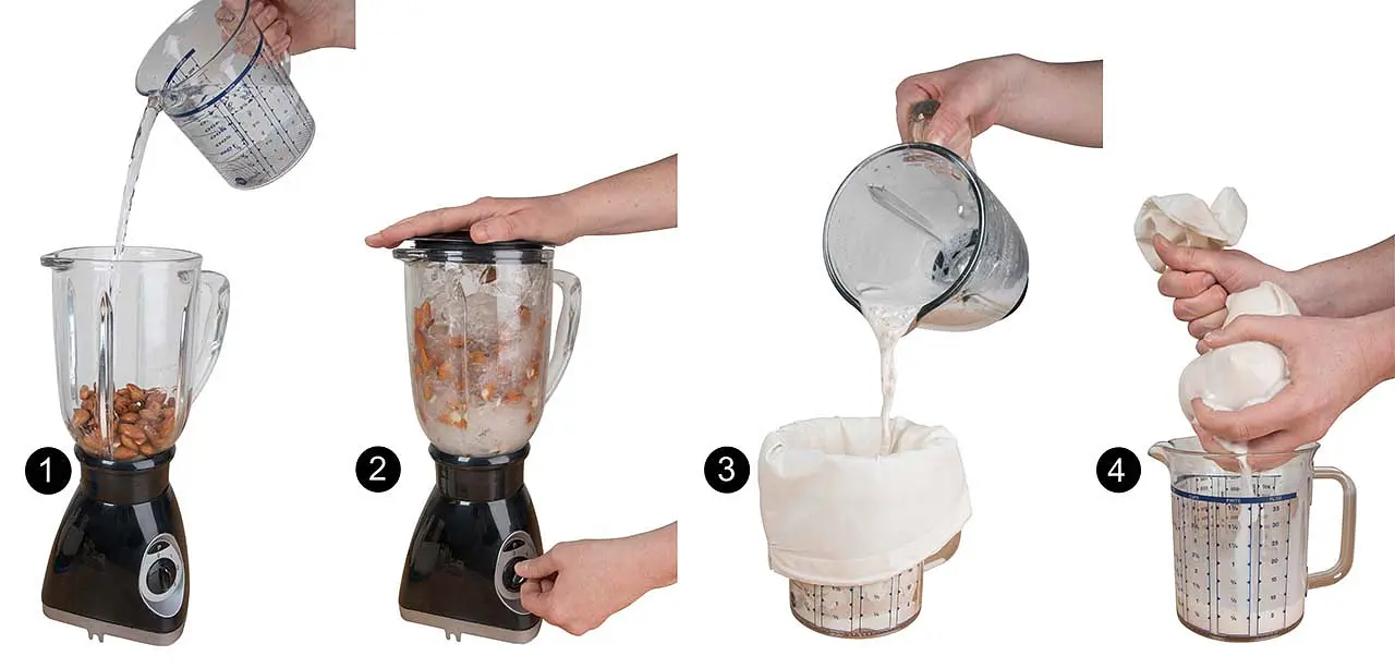 Nut and Seed Milk 1. Soak raw nuts, almonds, sesame, oats, etc., for several hours (for seeds: overnight) in water—this activates enzymes and breaks down antinutrients, improving milk digestibility. 2. Rinse the activated nuts or seeds and blend them with water in a blender. 3. Pour the mixture into the nut milk bag and gently squeeze the bag by hand to “milk” the liquid into a container. Best enjoyed fresh. 4. The pulp in the bag can be dried or frozen and later used for other recipes such as crackers, raw breads, cookies, or soups.
