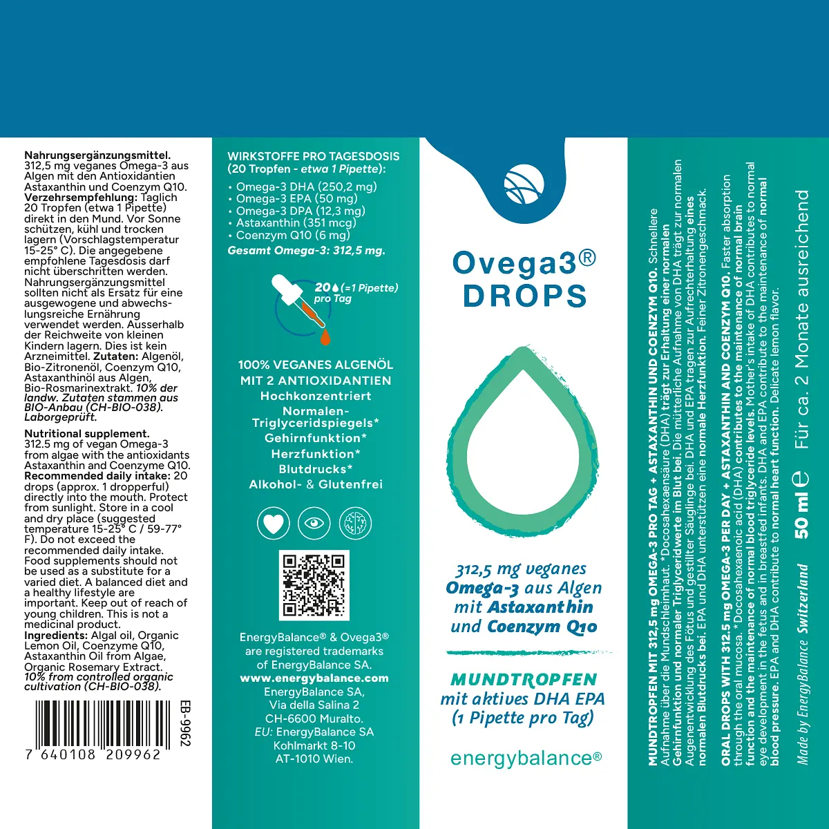 Ovega3 DROPS by EnergyBalance® provides pure DHA and EPA directly from microalgae – completely fish-free. The drops use the high-quality TG form for optimal bioavailability and are enriched with Coenzyme Q10 and Astaxanthin – two potent antioxidants for cell protection and vitality.
