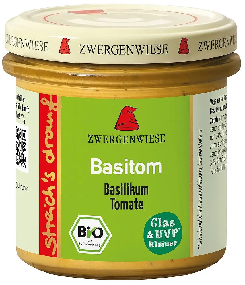Zwergenwiese Streich's drauf Basitom is a light and creamy vegetarian/vegan spread with a savoury and hearty flavour of basil and tomato. Basitom is vegan, lactose-free, milk protein-free, yeast-free and gluten-free.