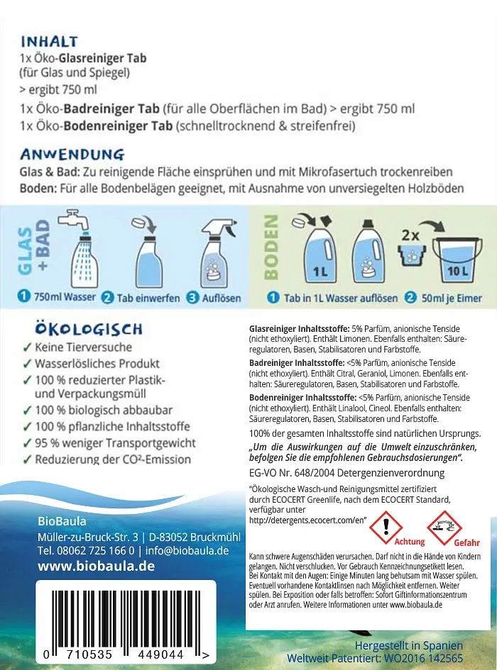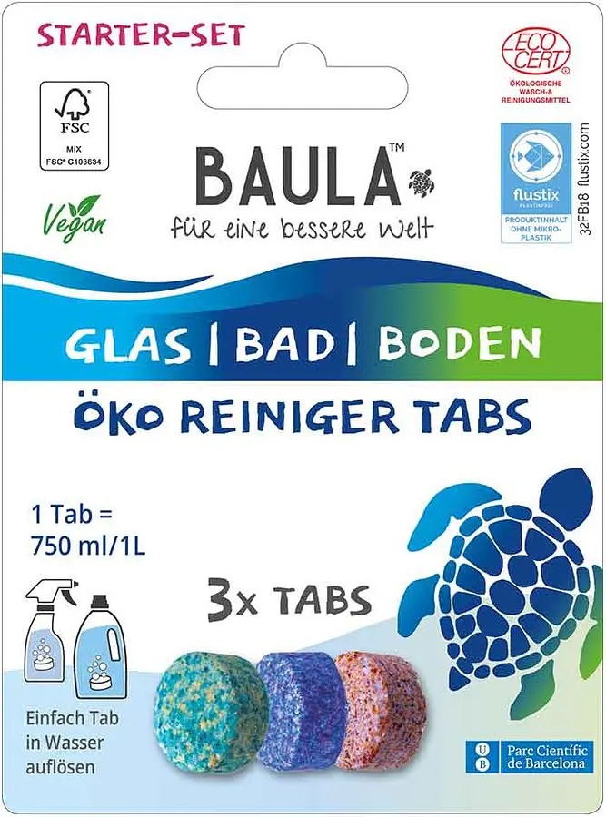 With BioBaula , you only buy the cleaning tabs and get a complete detergent by simply adding water. In addition, all BioBaula Tabs are 100% biodegradable and ecologically flawless .