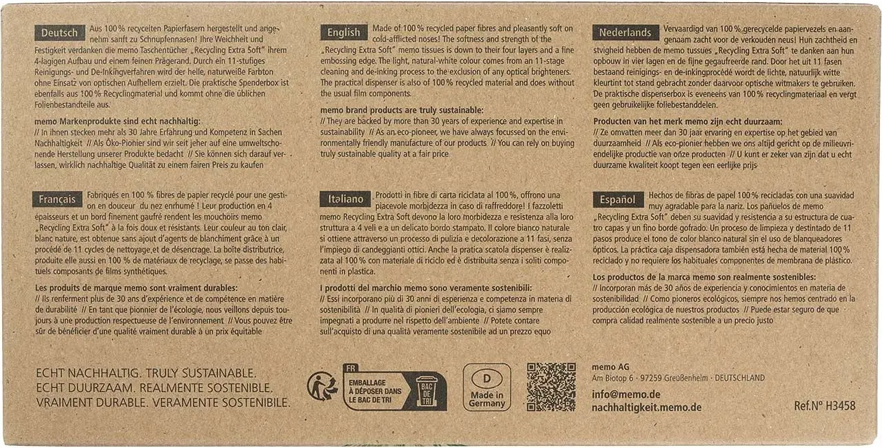 Gentle on every runny nose: memo “Recycling Extra Soft” tissues are especially soft yet tear-resistant thanks to their 4 layers and fine embossed edge. As the name suggests, the 100 tissues are made from recycled paper fibres, and the dispenser box is also produced from 100% recycled material and without plastic film – helping to conserve valuable resources.
