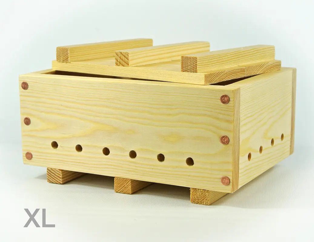 The TofuBox is a quality product: made of prime grade European pine, joined with glue, rust-free copper nails and solid brass pins, and finished with food-safe, pure walnut oil. The box walls are 15 mm thick for durability.