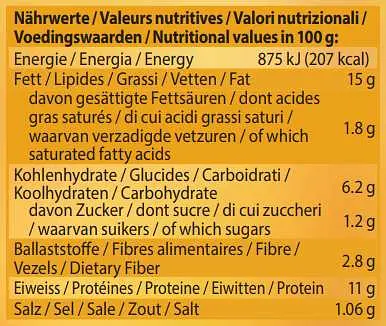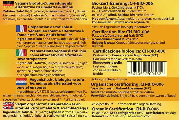Tofu* 87.3% (water, SOYA beans* from EU, Nigari), high oleic sunflower oil*, spices*, rock salt, chickpea flour*