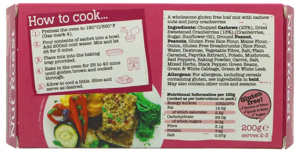 cashews (23%), cranberries (13%) (cranberries, sugar, sunflower oil),ground peanuts, peanuts, gluten free rice flour, maize flour, minced onion, gluten free breadcrumbs (rice flour, water, dextrose, vegetable fibre, salt, caramel (e150a), paprika), country veg mix (potato, carrot, onion, green beans, green & white cabbage, green & white leek), dried mushrooms, red peppers, gluten free baking powder, salt, mixed herbs, black pepper