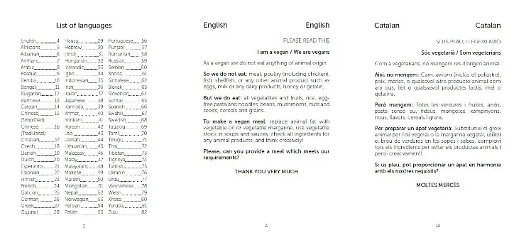 The essential passport sized travelling companion for vegans now includes 74 languages, covering over 95% of the world's population, with a page saying what vegans do and don't eat in great detail. Let the waiter show it to the cook and you'll be sure of a totally vegan, animal free feast in restaurants anywhere even if no one speaks a word of your language.